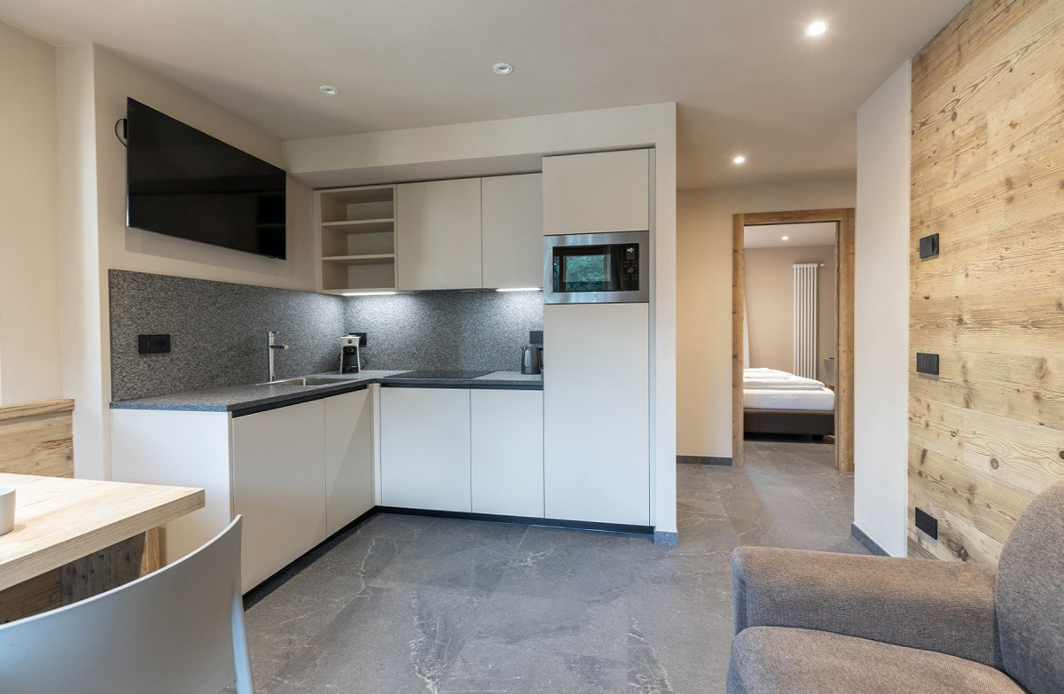 50 m² - 1 ložnice s manželskou postelí či 2 samostatnými lůžky, 1 pokoj s 1 samostatným lůžkem, obývací pokoj s kuchyňským koutem a rozkládacím gaučem pro 1 osobu, sociální zařízení se sprchou, terasa; apartmán se nachází v přízemí