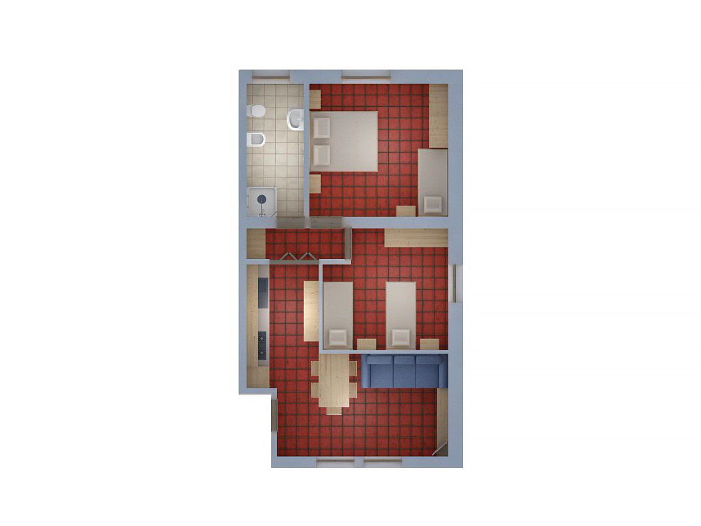 85 m² – 1 ložnice s manželskou postelí, 1 ložnice s manželskou postelí a 1 dalším samostatným lůžkem, 1 ložnice s 2 samostatnými lůžky, obývací pokoj s kuchyňským koutem, 2x sociální zařízení, balkon, velká krytá terasa s výhledem na jezero; apartmán se nachází v 1. podlaží