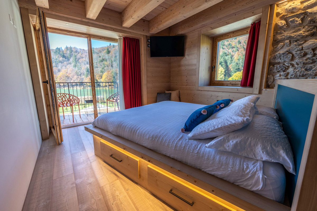 55 m² - ložnice s manželskou postelí v neuzavřeném mezipatře, obývací pokoj s 2 samostatnými lůžky a případně přistýlkou pro 1 osobu, obytná kuchyně se sedací částí, sociální zařízení, terasa s výhledem na jezero