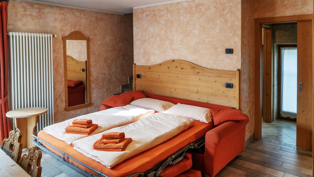 trilo 6/7 - dvoupodlažní; 1. podlaží – obývací pokoj s kuchyňským koutem a rozkládacím gaučem pro 2 osoby, sociální zařízení se sprchou, malý balkon, 2. podlaží - 1 ložnice s manželskou postelí nebo 2 samostatnými lůžky, 1 ložnice se 2/3 samostatnými lůžky, sociální zařízení se sprchou; vchod do apartmánu v 1. patře