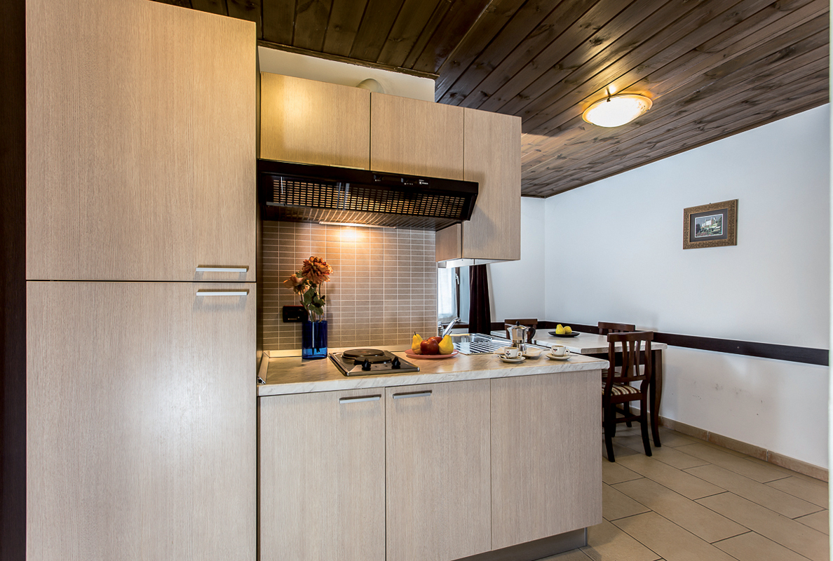 40 m² - 1 ložnice s manželskou postelí s oddělitelnými lůžky, 1 ložnice se 2 samostatnými lůžky či rozkládací palandou, obývací pokoj s kuchyňským koutem a rozkládacím gaučem či případně částečně oddělenou rozkládací palandou v chodbě, sociální zařízení