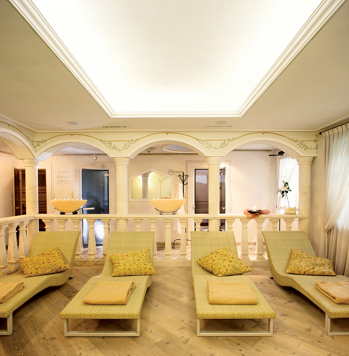 bazén s vířivkou až pro 6 osob, finská sauna, biosauna, pára, multifunkční sprcha, relaxační koutek s lehátky a hudbou, masáže*, kosmetické služby*, biliár, stolní tenis, stolní fotbal