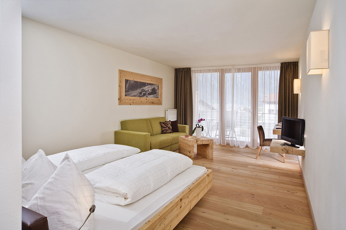30 m² - pokoj s manželskou postelí a rozkládacím gaučem pro 2 osoby, sociální zařízení se sprchou, balkon nebo terasa