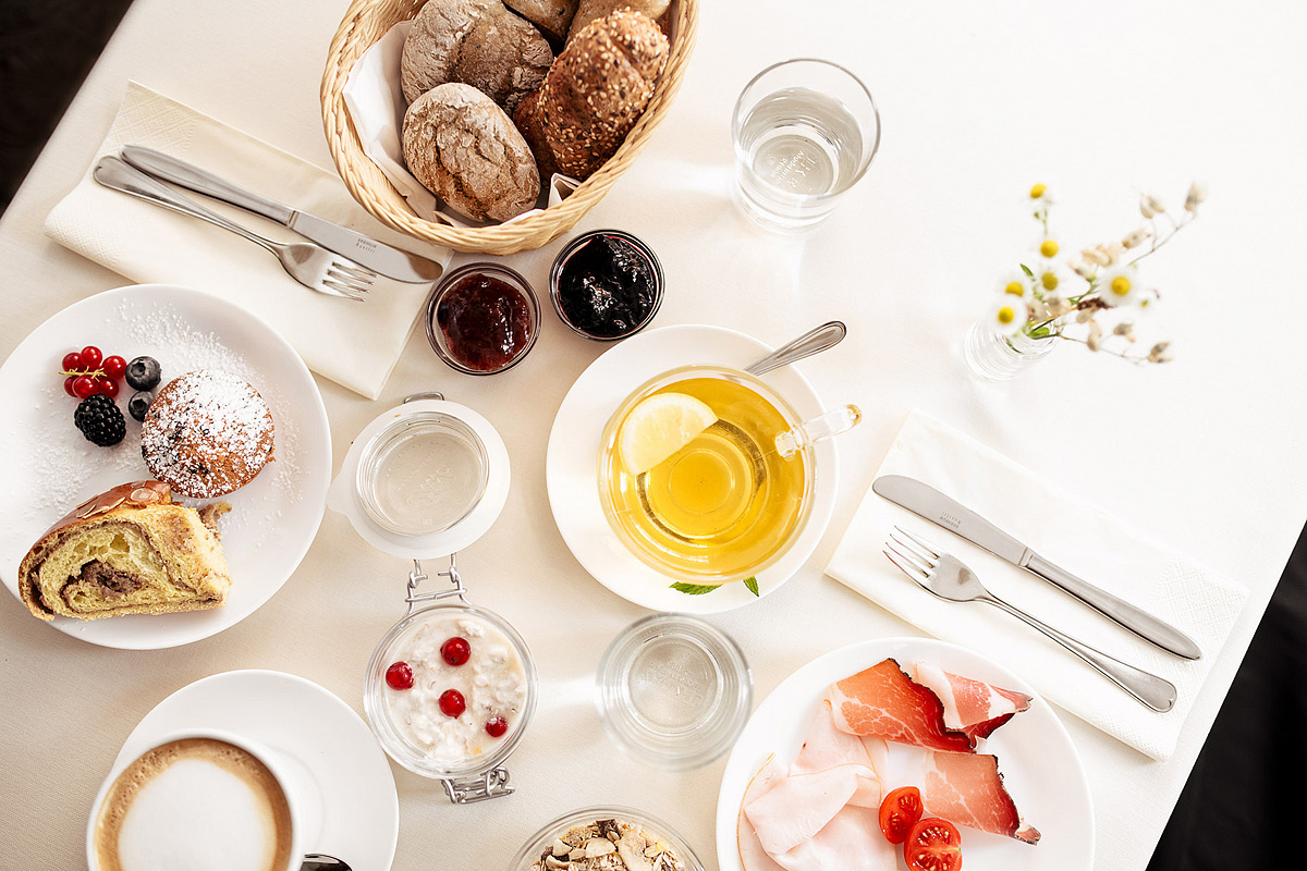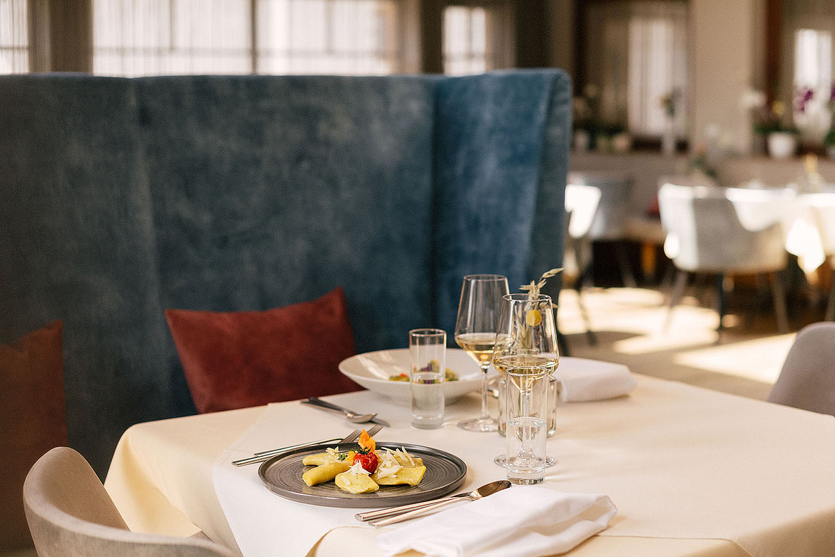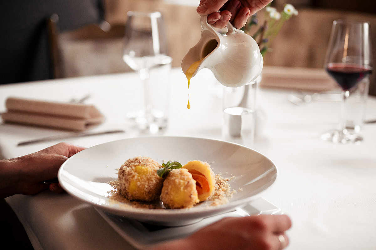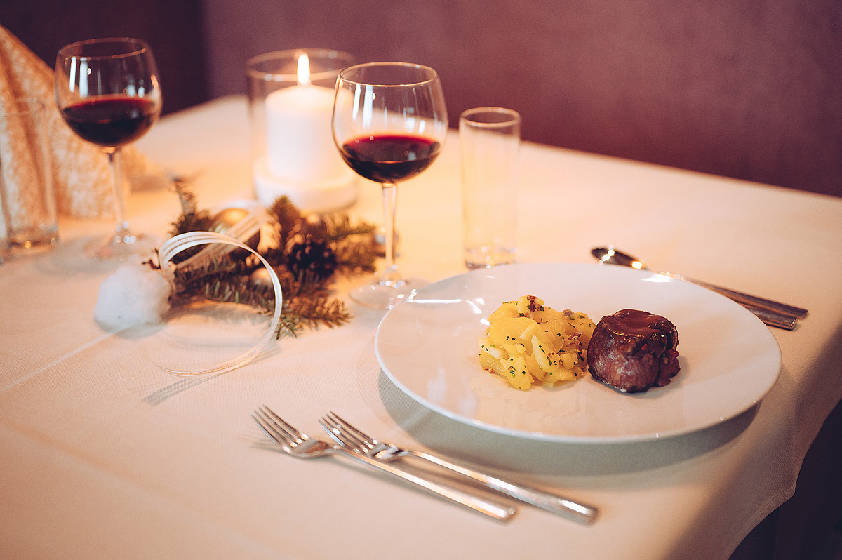servírované menu s výběrem ze 2 teplých předkrmů, 2 hlavních jídel s přílohou a 2 až 3 dezertů či ovoce, salátový bufet, nápoje za poplatek