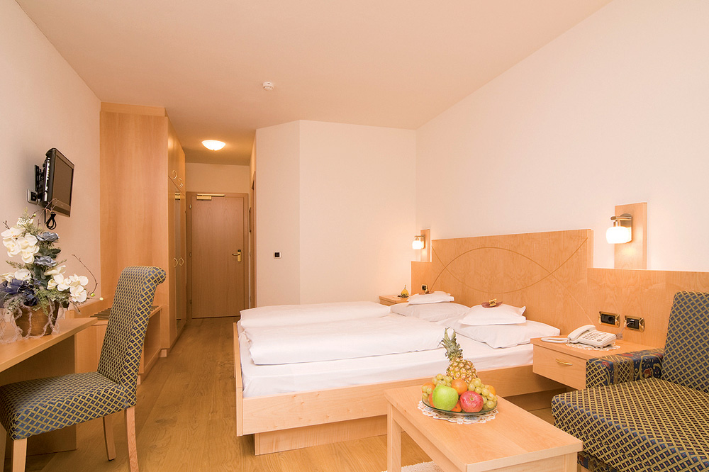 pokoj 2/3/4 Comfort - prostornější pokoj s manželskou postelí a případně rozkládacím gaučem pro 1 či 2 osoby, sociální zařízení, zpravidla balkon; pokoje v nové části hotelu