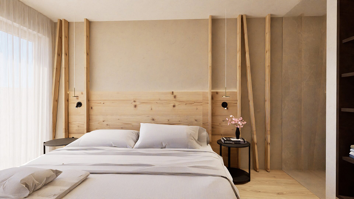 60 m² - 1 ložnice s manželskou postelí, 1 ložnice bez okna oddělená od manželské ložnice posuvnou stěnou s 2 samostatnými lůžky a samostatným vchodem, obývací pokoj s kuchyňským koutem a rozkládacím gaučem pro 2 osoby, sociální zařízení, druhá sprcha v manželské ložnici, balkon