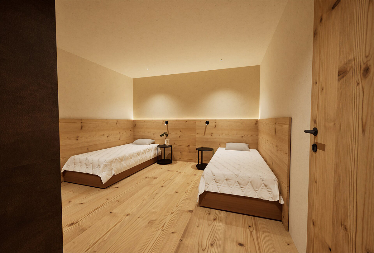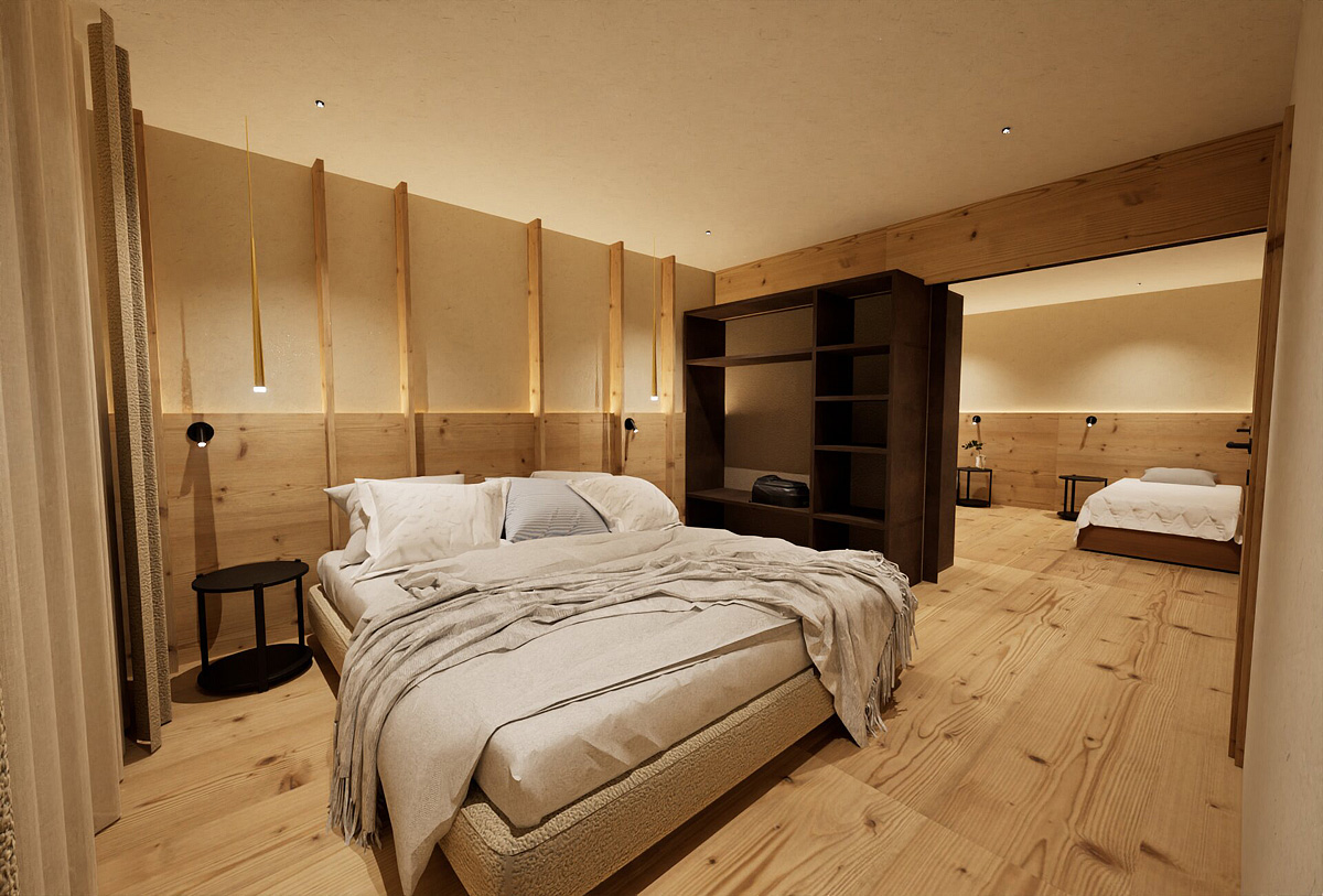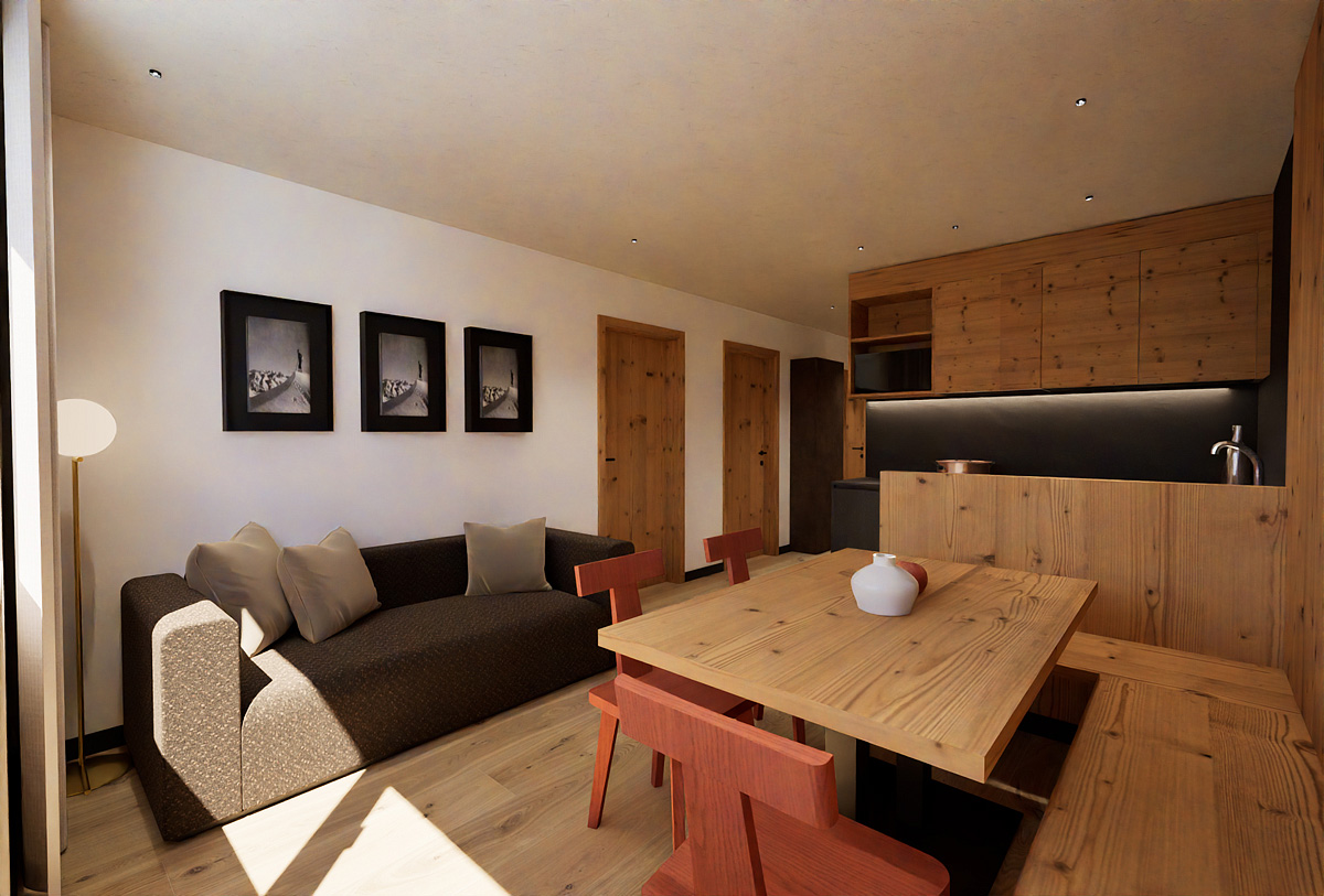 55 m² - 1 ložnice s manželskou postelí, 1 ložnice bez okna oddělená od manželské ložnice posuvnou stěnou s 2 samostatnými lůžky a samostatným vchodem, obývací pokoj s kuchyňským koutem a rozkládacím gaučem pro 2 osoby, sociální zařízení, balkon s panoramatickým výhledem na hory