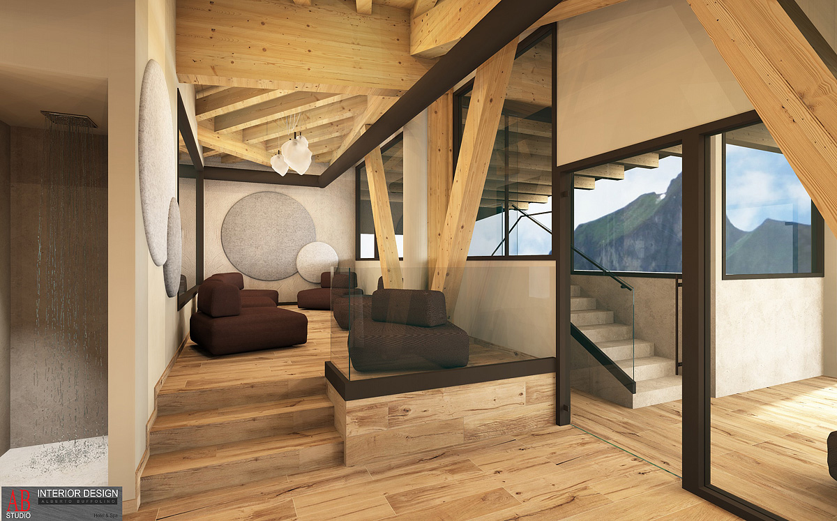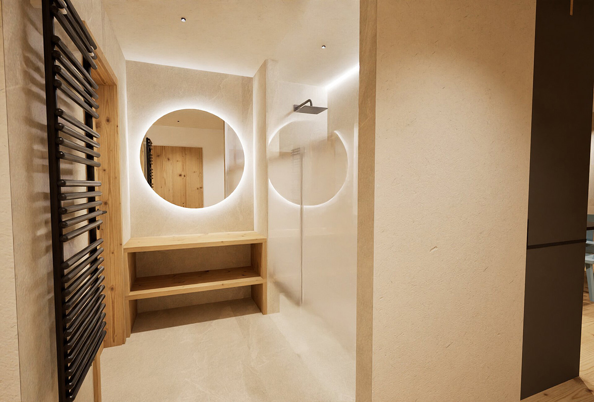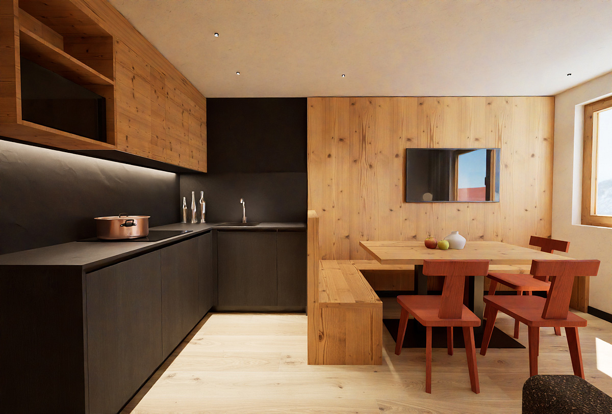 52 m² - 1 ložnice s manželskou postelí a volně stojící vanou, obývací pokoj s kuchyňským koutem a rozkládacím gaučem pro 2 osoby, relaxační místnost se saunou, sociální zařízení, balkon s panoramatickým výhledem