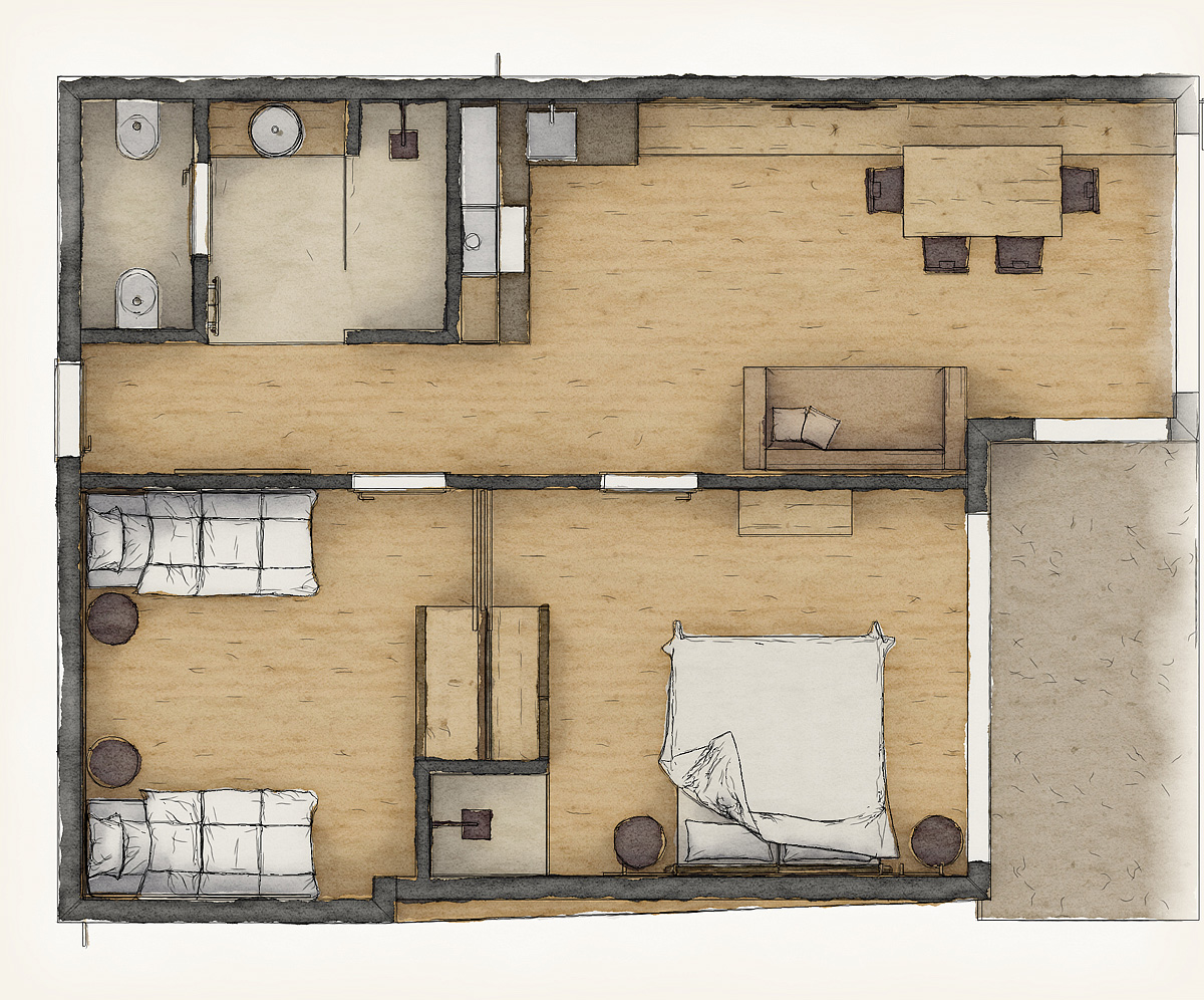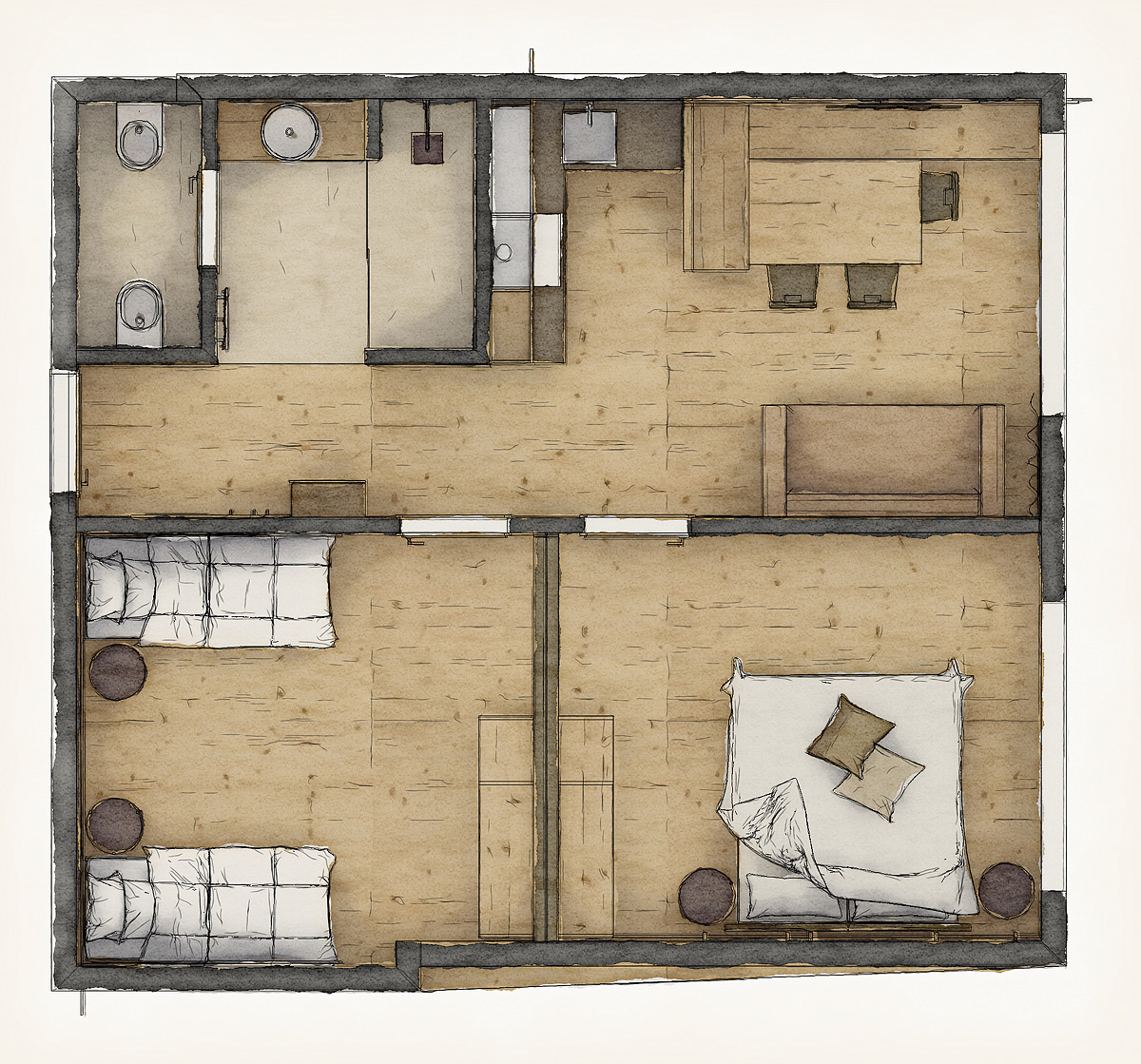 52 m² - 1 ložnice s manželskou postelí, 1 ložnice bez okna oddělená od manželské ložnice posuvnou stěnou s 2 samostatnými lůžky a samostatným vchodem, obývací pokoj s kuchyňským koutem a rozkládacím gaučem pro 2 osoby, sociální zařízení