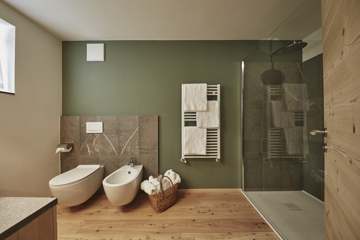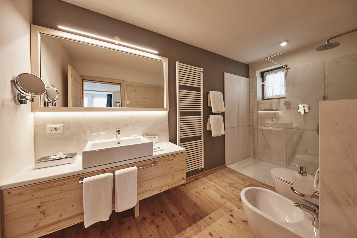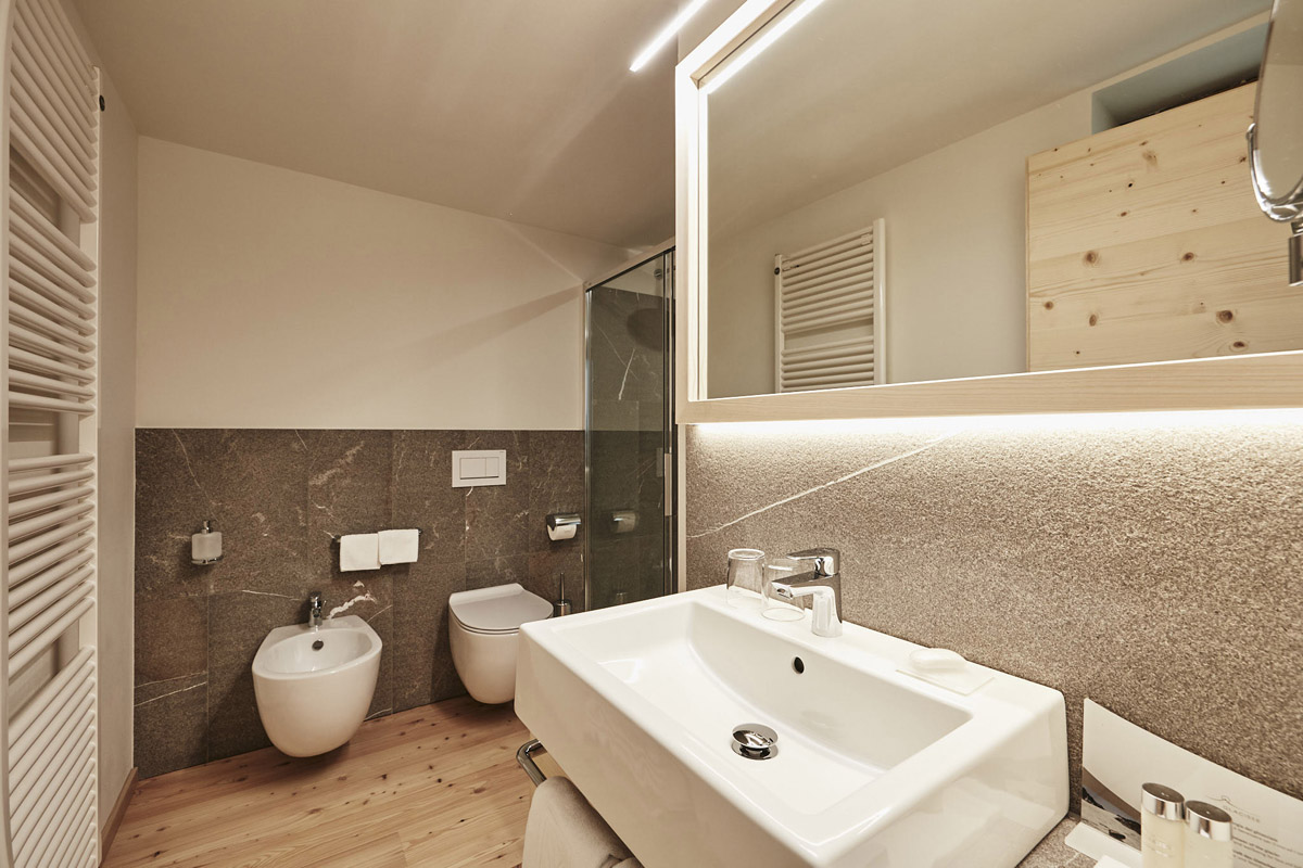 TV sat., telefon, fén, trezor, wi-fi připojení k internetu, minibar, jablka z oblasti Val Venosta, termofor, psací stůl, župany a pantofle do wellness, kosmetika Glacisse