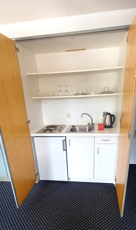 TV sat., telefon, fén, wi-fi připojení k internetu; malý kuchyňský kout s malou ledničkou a rychlovarnou konvicí