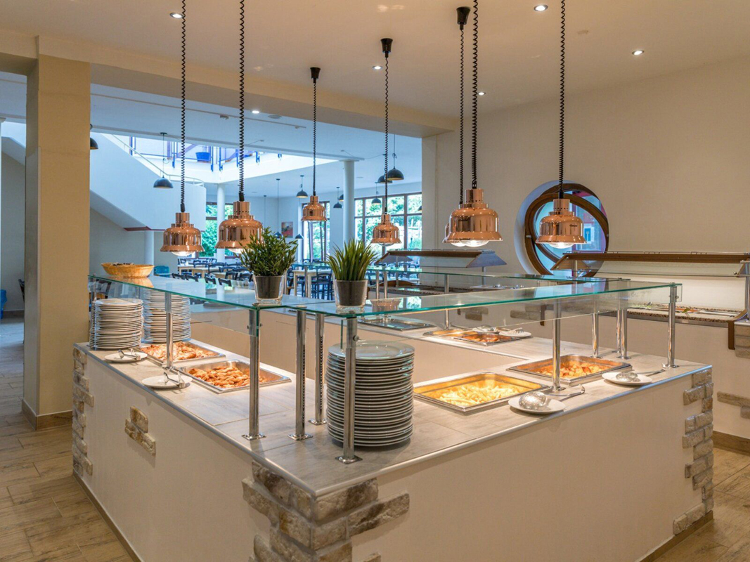 formou bufetu studených a teplých předkrmů, hlavních jídel s přílohou, salátů a dezertů, samostatný dětský bufet; od 12.00 do 21.00 hod. vybrané nealkoholické nápoje, od 16.00 do 21.00 pivo a stolní víno, ostatní nápoje za poplatek