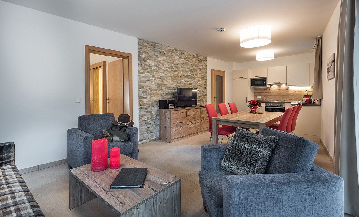 90 m² - 3 ložnice s manželskou postelí, obývací pokoj s kuchyňským koutem a případně rozkládacím gaučem pro 2 osoby, předsíň / šatna, 2x až 3x sociální zařízení se sprchou či vanou, úschovna lyží a lyžařských bot, balkon