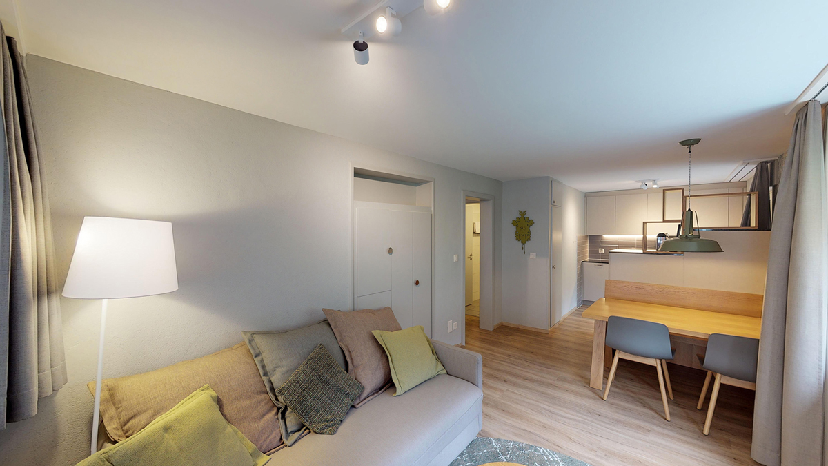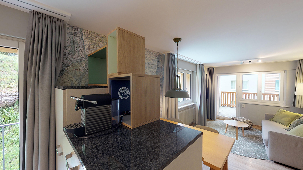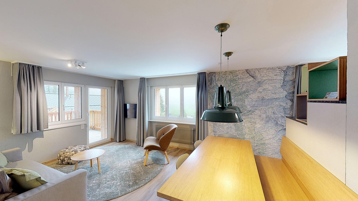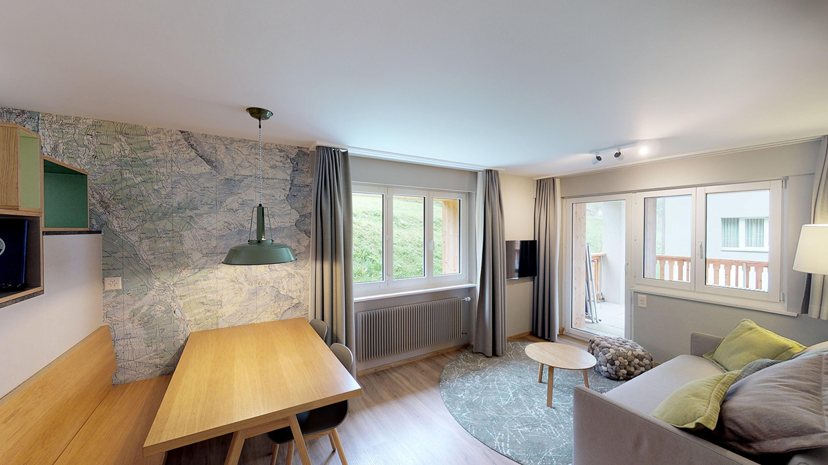 38 m² - ložnice se 2 samostatnými lůžky, obývací pokoj s kuchyňským koutem a rozkládacím gaučem pro 2 osoby, sociální zařízení, balkon; apartmán zpravidla v podkroví se sešikmeným nižším stropem